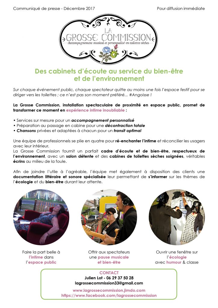 Bonjour, Nous vous présentons La Grosse Commission, une installation spectaculaire sous la forme d’un entre-sort ! Le propos interpelle. L’installation est quant à elle visuelle, chic, décalée, musicale, interactive et tellement drôle, c’est un très bon outil pour aborder deux notions sociétales actuelles : l’intimité de la personne et le respect de l’environnement. Vous trouverez lire la suite