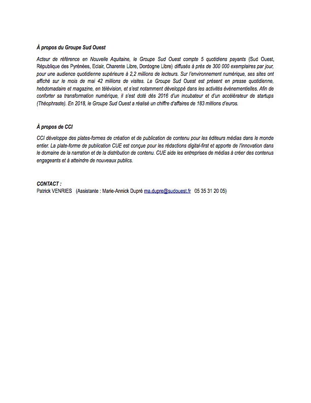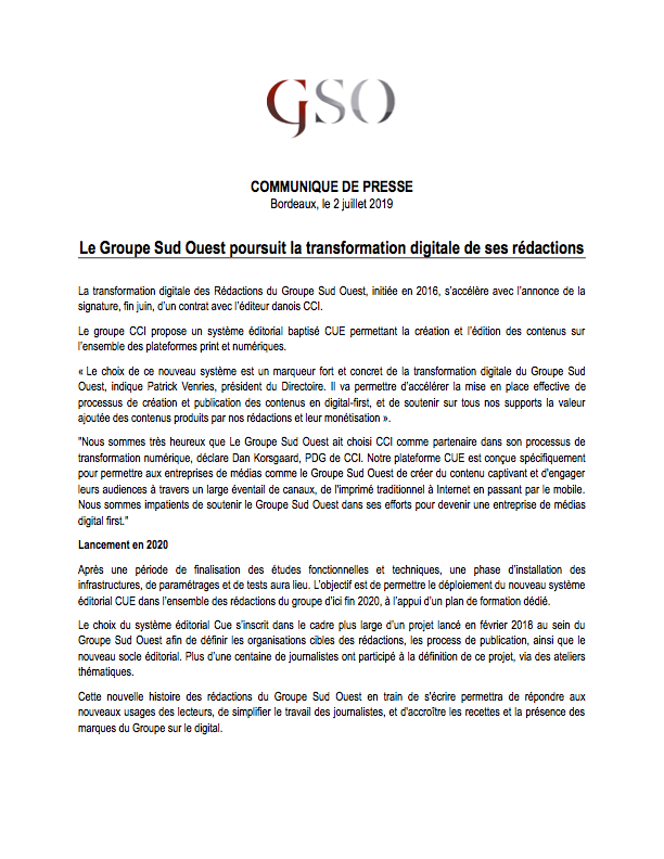 Communiqué de presse « Le Groupe Sud Ouest poursuit la transformation digitale de ses rédactions » en pdf ici.