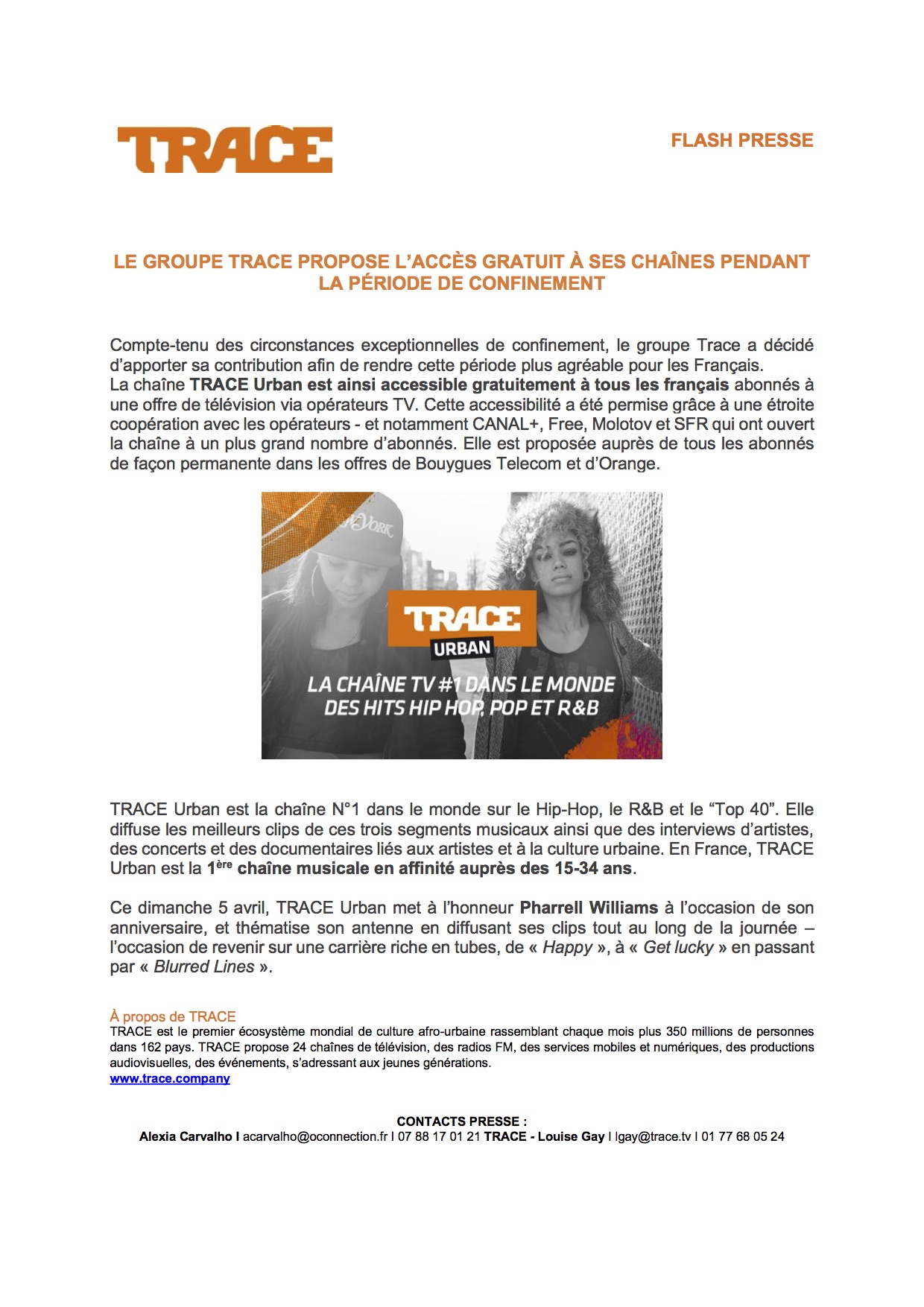 Compte-tenu des circonstances exceptionnelles de confinement, le groupe Trace a décidé d’apporter sa contribution afin de rendre cette période plus agréable pour les Français. La chaîne TRACE Urban est ainsi accessible gratuitement à tous les français abonnés à une offre de télévision via opérateurs TV. Cette accessibilité a été permise grâce à une étroite coopération avec les opérateurs – et notamment CANAL+, Free, Molotov et SFR qui ont ouvert la chaîne à un plus grand nombre d’abonnés. Elle est proposée auprès de tous les abonnés de façon permanente dans les offres de Bouygues Telecom et d’Orange.