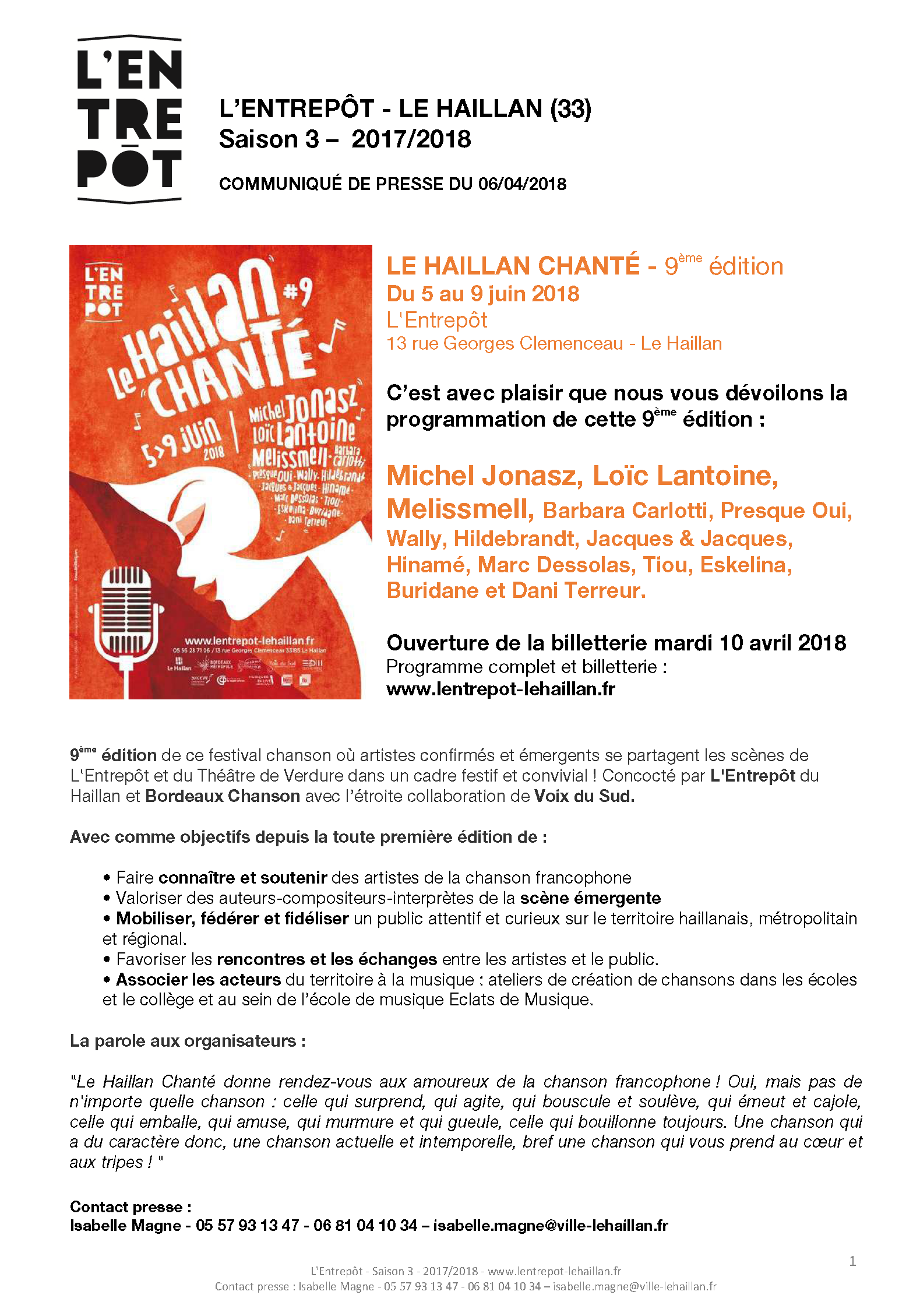 Accueil > Communiqués > LE HAILLAN CHANTÉ ! 9ème édition / du 5 au 9 juin 2018