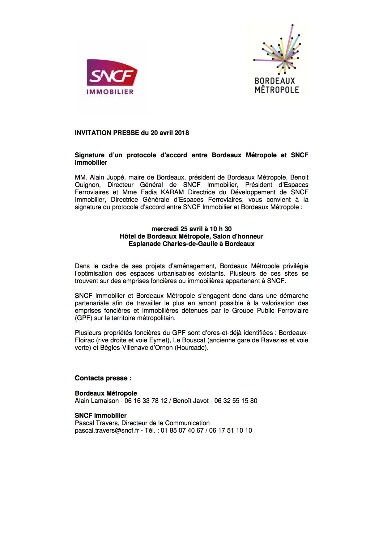 Accueil > Communiqués > Invitation presse – Signature d’un protocole d’accord entre Bordeaux Métropole et SNCF Immobilier