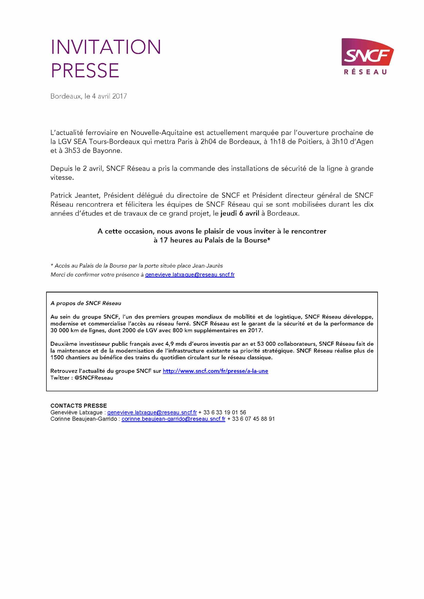 Je vous prie de bien vouloir trouver ci-joint une invitation à participer à un point presse à l’occasion de la venue à Bordeaux de Patrick Jeantet, Président délégué du directoire de SNCF et Président directeur général de SNCF Réseau, le jeudi 6 avril 2017.