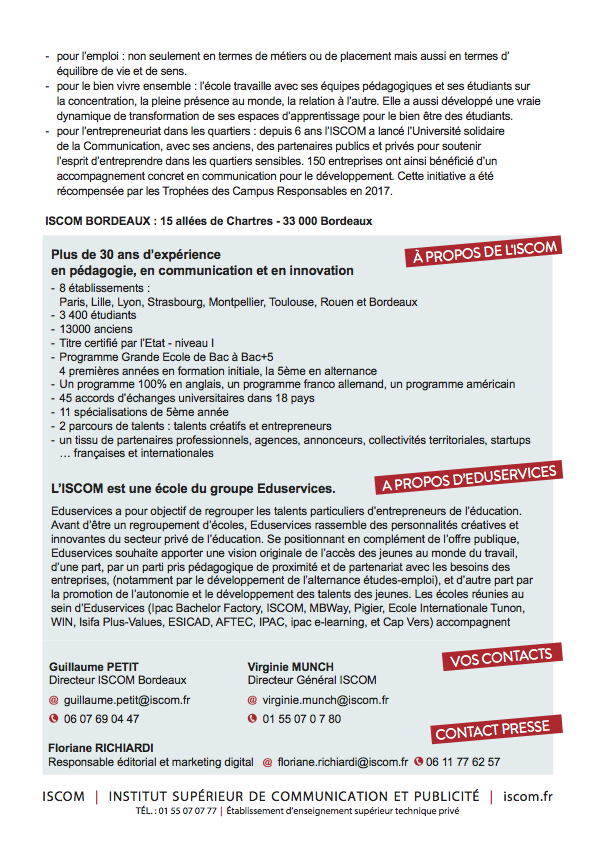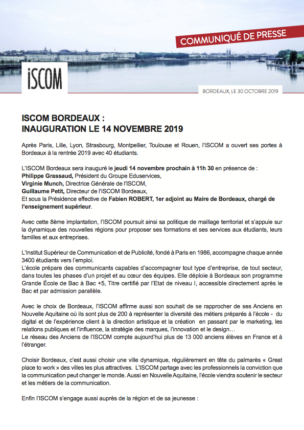 Accueil > Communiqués > ISCOM Bordeaux : inauguration le 14/11/2019