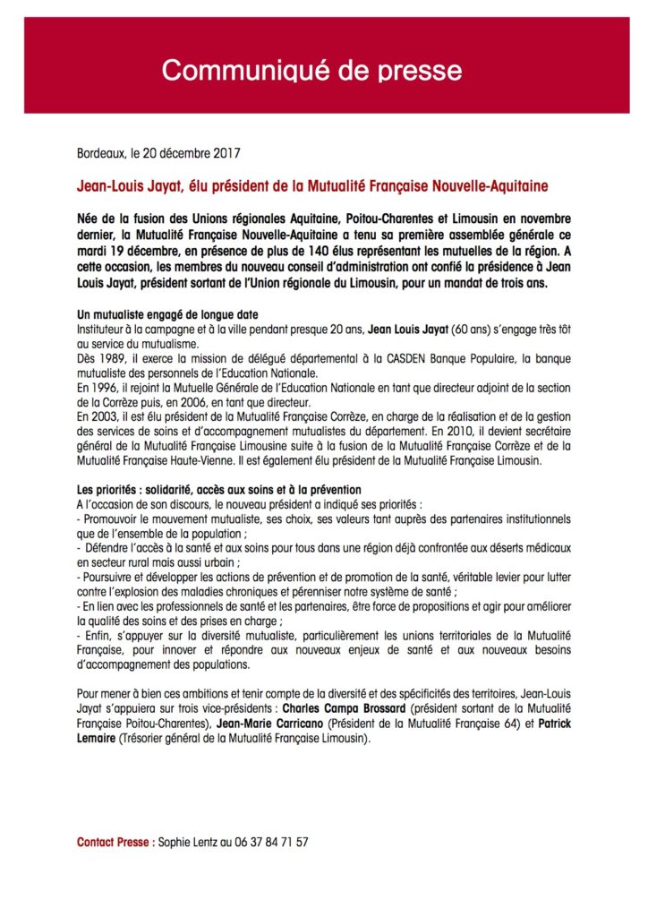 Bonjour, Suite à la fusion des Unions régionales Aquitaine, Poitou-Charentes et Limousin en novembre dernier, la Mutualité Française Nouvelle-Aquitaine a tenu sa première assemblée générale ce mardi 19 décembre. A cette occasion, Jean Louis Jayat, président sortant de l’Union régionale du Limousin, a été élu président pour un mandat de trois ans. Vous trouverez en lire la suite
