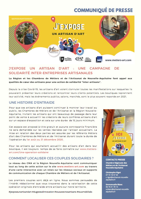CP « J’expose un artisan d’art » en Nouvelle-Aquitaine > campagne de solidarité entre artisans : CP REGIONAL J’EXPOSE UN ARTISAN D’ART 2020
