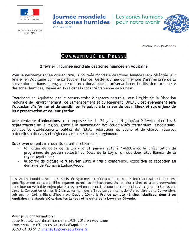 Pour la neuvième année consécutive, la journée mondiale des zones humides sera célébrée le 2 février en Aquitaine comme partout en France.