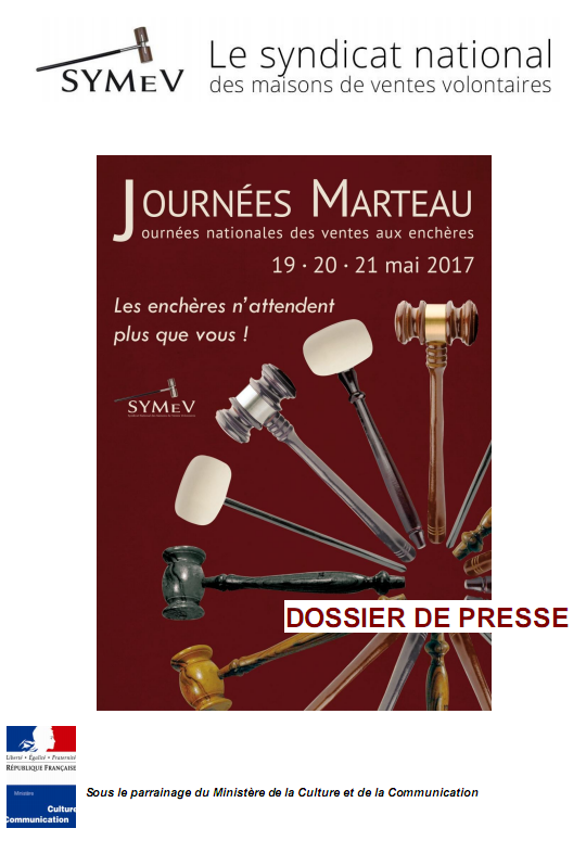 Madame, Monsieur, Nous vous prions de bien vouloir trouver ci-joint le dossier de presse des Journées Marteau 2017 organisées par le SYMEV les 19, 20 et 21 mai prochains. Partout en France, les maisons de ventes aux enchères ouvriront leurs portes au grand public afin de lui faire découvrir le monde fascinantdes enchères et la lire la suite