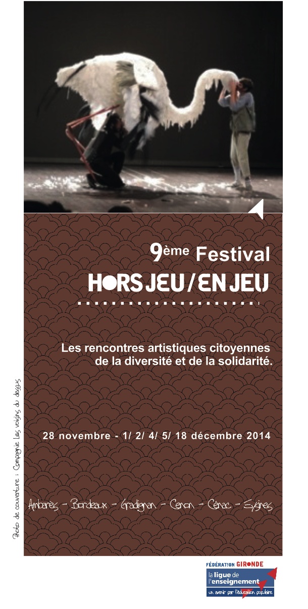 La Ligue de l’enseignement – Fédération de la Gironde, présente le 28 novembre et les 1, 2, 4, 5 et 18 décembre 2014 sa 9ème édition du festival Hors Jeu / En Jeu dans plusieurs lieux de l’agglomération bordelaise.