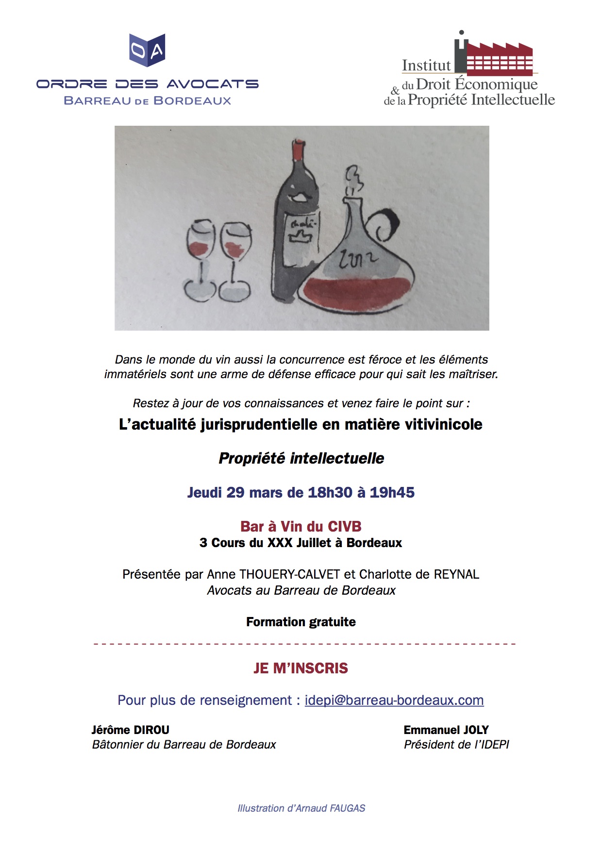 Mesdames, Messieurs, Je vous remercie de noter ce RDV. Les avocats du Barreau de Bordeaux vous proposeront un point factuel de façon à vous permettre d’actualiser vos connaissances juridiques pour le secteur viticole. En copie jointe l’invitation. Bonne réception, Isabelle Missègue 06 09 05 21 27 Communiqué en pdf : idepi-invitation-vin