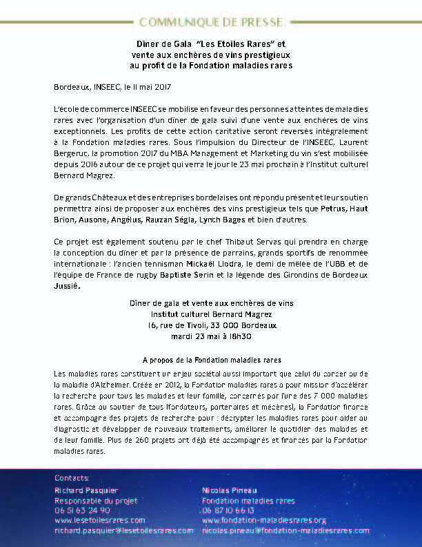 Madame, Monsieur, Je me permets de vous adresser un communiqué de presse concernant un événement haut de gamme LES ETOILES RARES. Ce dîner de gala sera suivi d’une vente des vins aux enchères et aura lieu à l’Institut Culturel Bernard Magrez ce mois le 23 mai 2017. Cet événement est organisé par l’école INSEEC en lire la suite