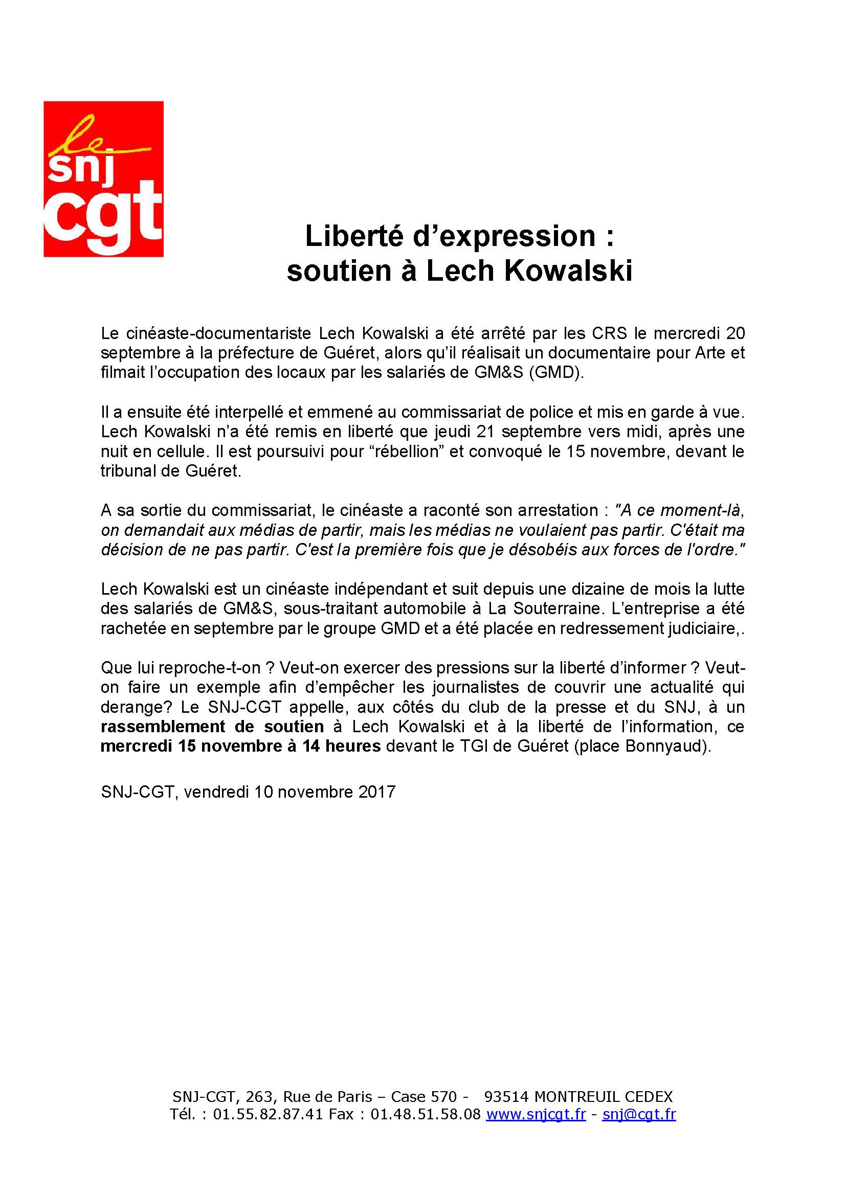 Bonjour, Vous trouverez, en pièce jointe, notre communiqué : « Liberté d’expression : soutien à Lech Kowalski « . Cordialement. SNJ-CGT