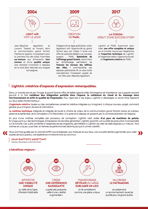 Spécialistes de l’impression et de la communication grand format, LightAir allie ses compétences conseil et créative à son expertise technique pour offrir aux marques des espaces d’expression sur-mesure, leur apporter une visibilité unique et créer une expérience saisissante auprès de leur public.