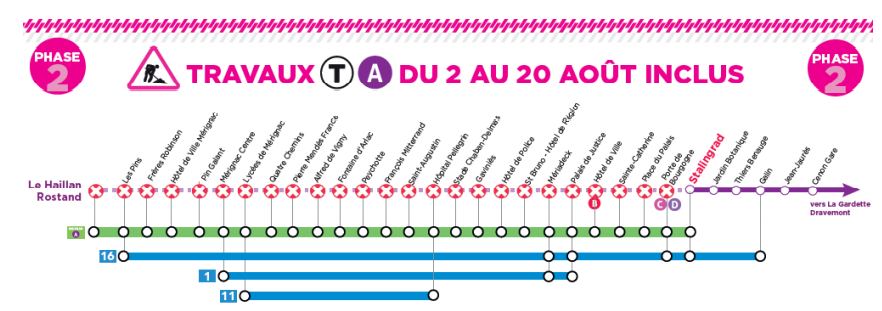 À partir du 2 août et jusqu’au 20 août inclus, la seconde phase des travaux sur la ligne de tram A débute. Pendant cette période, le tram A va être interrompu entre Stalingrad et le Haillan Rostand. Cette nouvelle phase de travaux a pour but de remplacer les rails APS (alimentation par le sol) et de faire des opérations de maintenance sur les infrastructures de la ligne. Des bus relais vont être mis à disposition des voyageurs.