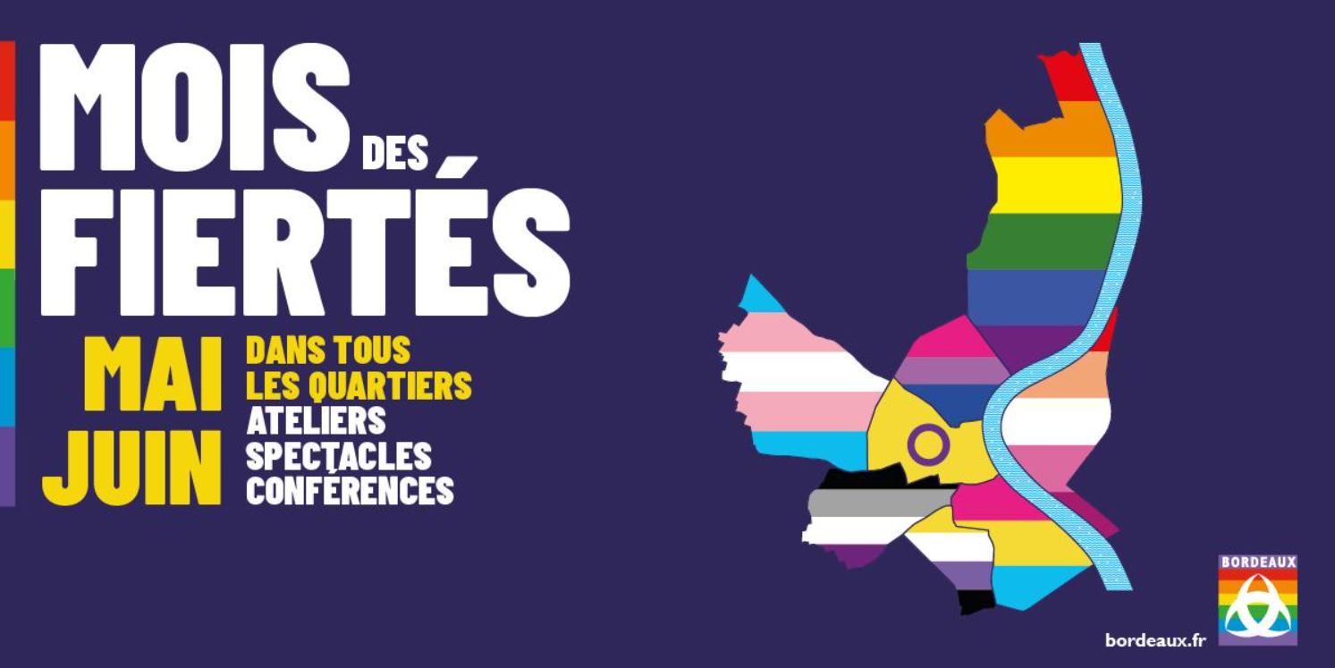 Du mardi 17 mai (Journée mondiale de lutte contre l'homophobie, la transphobie et la biphobie) au jeudi 30 juin 2022, Bordeaux célèbre le Mois des fiertés : des conférences, des spectacles, des concerts, des lectures pour rendre visible et mettre à l'honneur les luttes et les fiertés LGBTQI+.