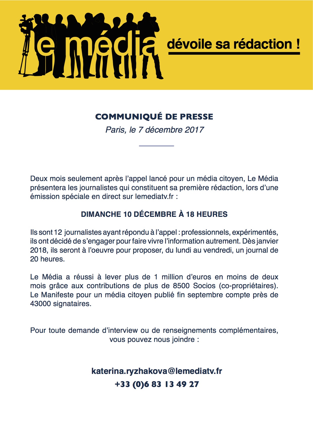 COMMUNIQUÉ DE PRESSE Paris, le 7 décembre 2017   Deux mois seulement après l’appel lancé pour un média citoyen, Le Média présentera les journalistes qui constituent sa première rédaction, lors d’une émission spéciale en direct sur lemediatv.fr : DIMANCHE 10 DÉCEMBRE À 18 HEURES Ils sont 12 journalistes ayant répondu à l’appel : professionnels, expérimentés, ils ont lire la suite