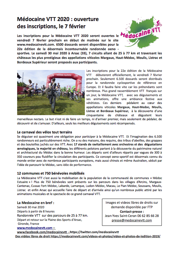 Contact-presse : Jean-Yves Saint-Ceran 06 62 85 66 28 presse@medocainevtt.com