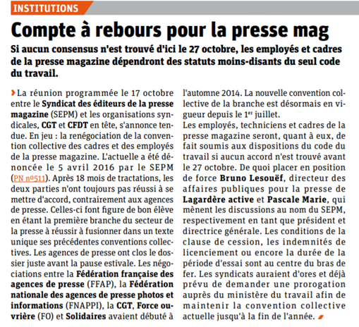 Le 27 octobre en l’absence d’accord les cadres et les employés de la presse magazine passeront au code du travail.
