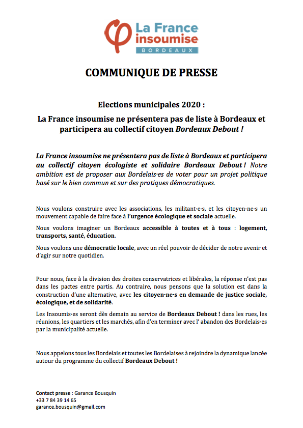 Déclaration officielle de la France Insoumise Bordeaux annonçant son positionnement pour les élections municipales de mars 2020 : communiqué de presse en pdf : Communiqué de presse LFI