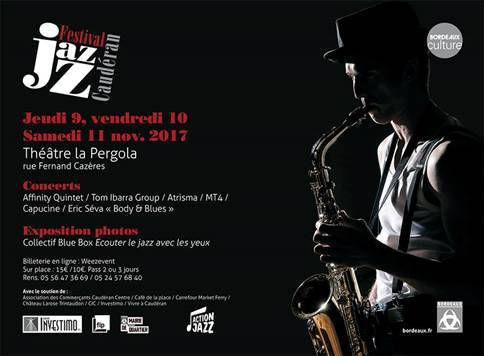 Jeudi 9, vendredi 10 et samedi 11 novembre 2017, le nouveau festival Jazz à Caudéran, en collaboration avec la mairie de quartier Bordeaux Caudéran et ses partenaires, propose 3 jours de concerts avec des artistes exceptionnels : Affinity Quintet, Tom Ibarra – Guitarist & Composer, Atrisma, MT4, Capucine et Eric SEVA Saxophoniste & Compositeur avec son nouveu projet Body & Blues.