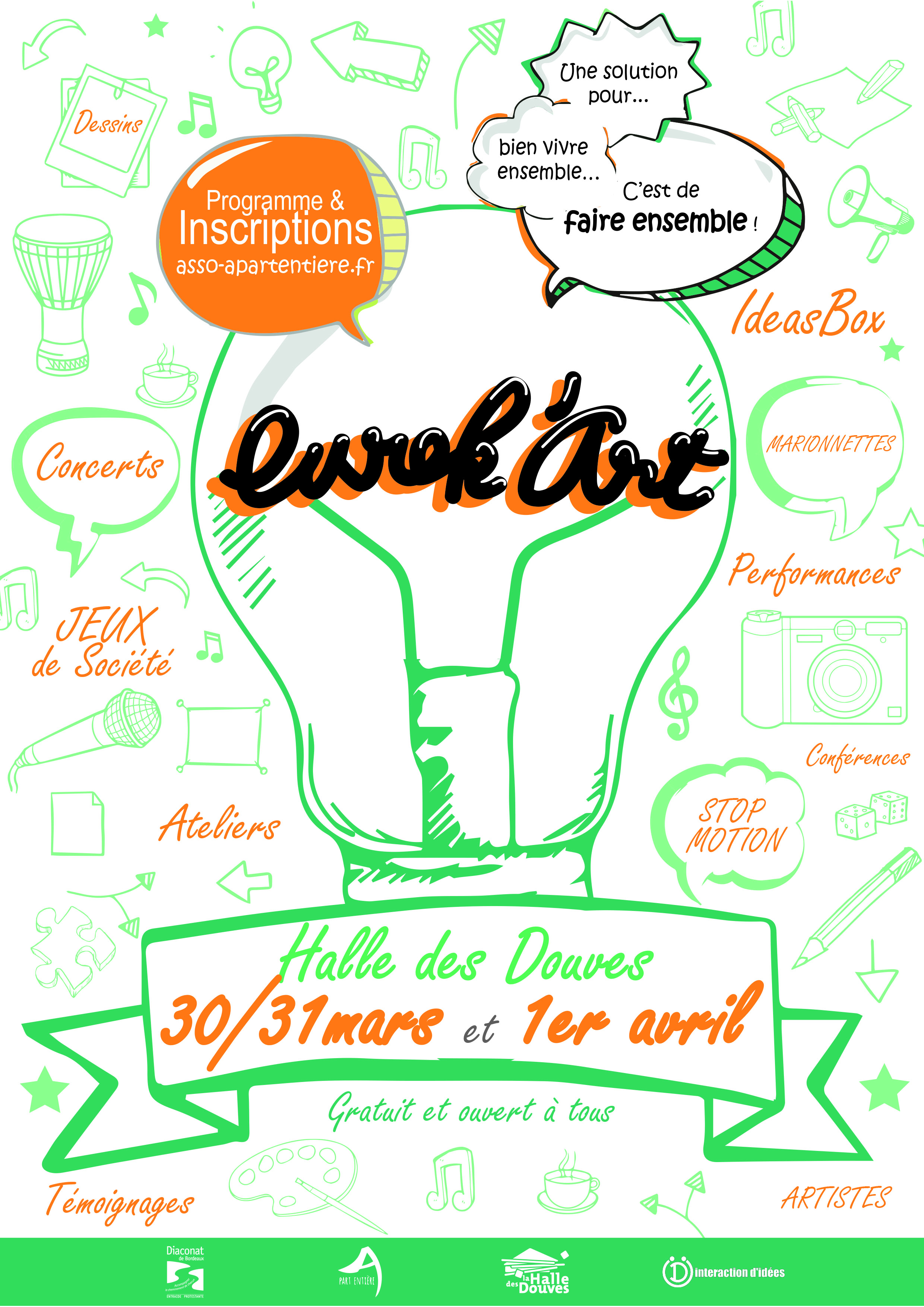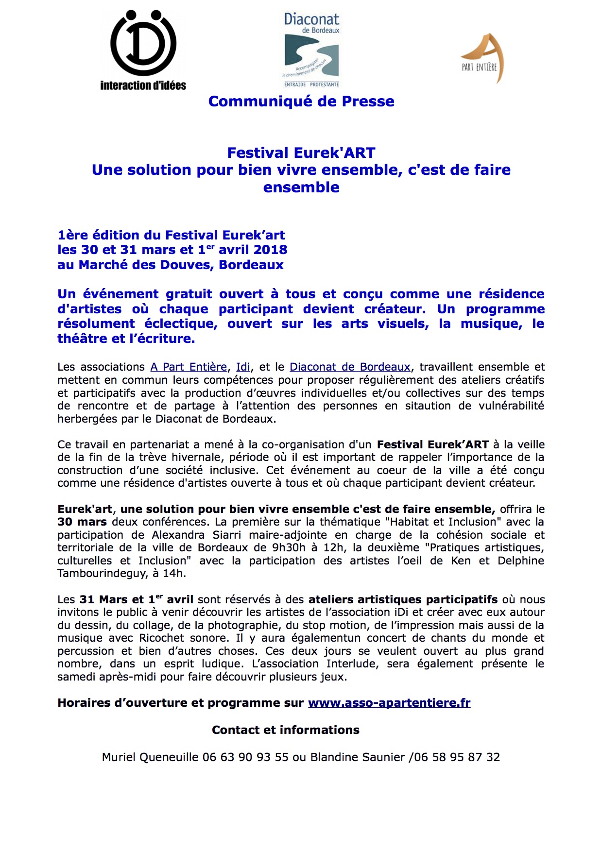 Bonjour, Les associations le Diaconat de Bordeaux, A part entière et iDi interactions d’idées, se sont unies afin de créer un événement culturel gratuit et ouvert à tous lors du weekend de Pâques, qui n’est autre que la fin de la trêve hivernale. Eurek’art : une solution pour bien vivre ensemble c’est de faire ensemble. lire la suite