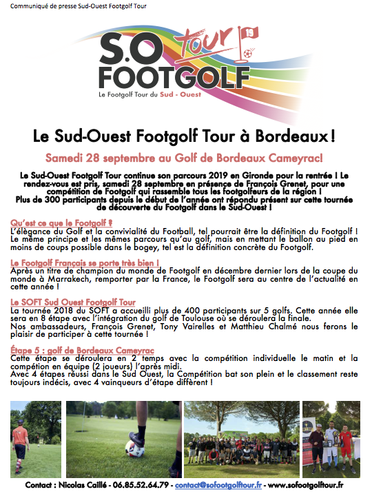 Voici le communiqué de presse concernant le Sud Ouest Footgolf Tour 2019 qui fait étape en Gironde pour la rentrée, plus précisément au Golf de Bordeaux – Cameyrac, samedi 28 septembre.