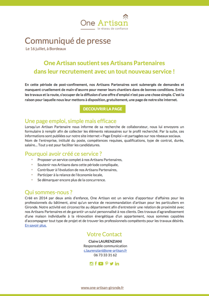 « One Artisan soutient ses Artisans Partenaires dans leur recrutement avec un tout nouveau service ! » CP en pdf : CP One Artisan – nouveau service