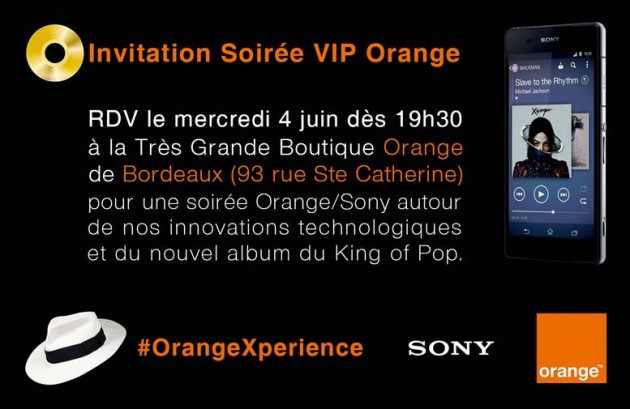 Invitation presse : Évènement Orange / Sony à Bordeaux le mercredi 4 juin Soirée exceptionnelle le mercredi 4 juin 2014 à 19h30 à la Très Grande Boutique Orange place Saint-Projet à l’occasion de la sortie du nouvel album de Michael Jackson. La Très Grande Boutique Orange de Bordeaux (93, rue Ste-Catherine) s’associe à Sony et organise une soirée réservée à la presse et aux lire la suite