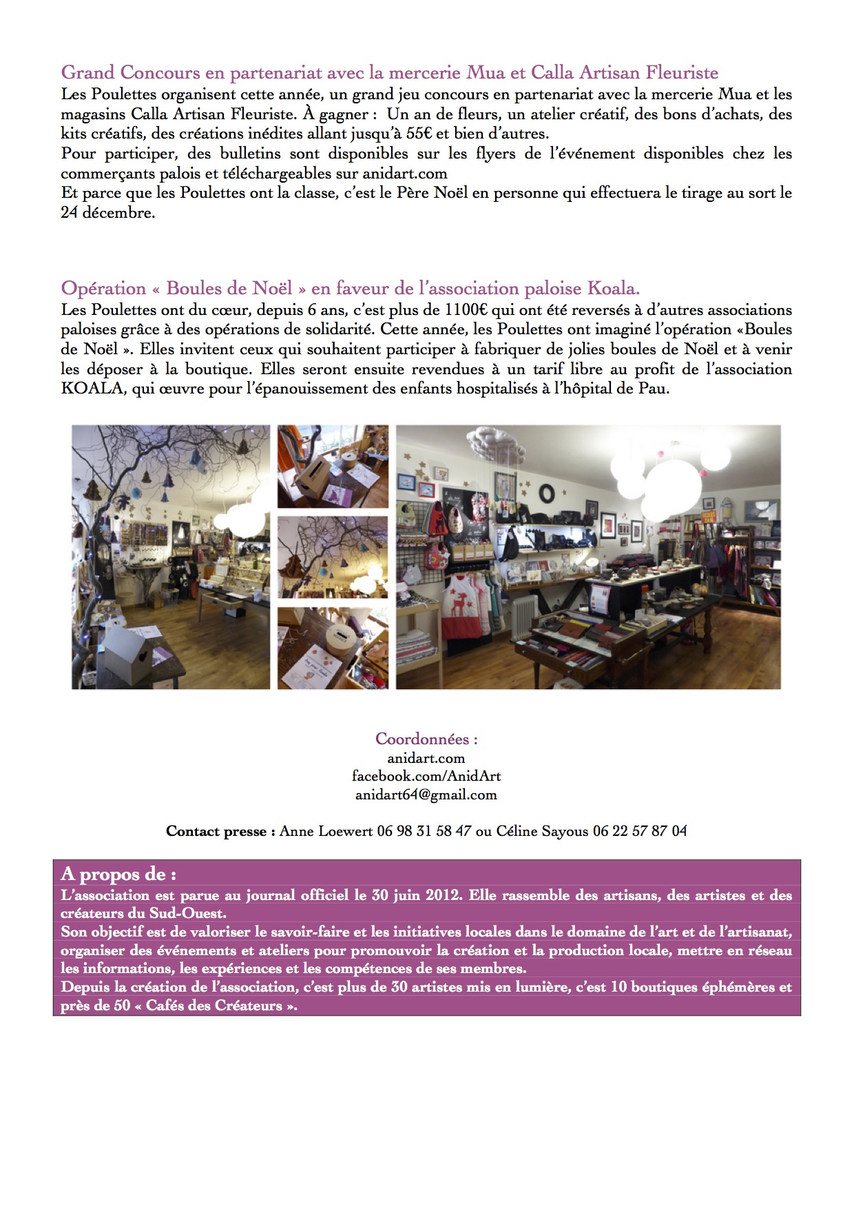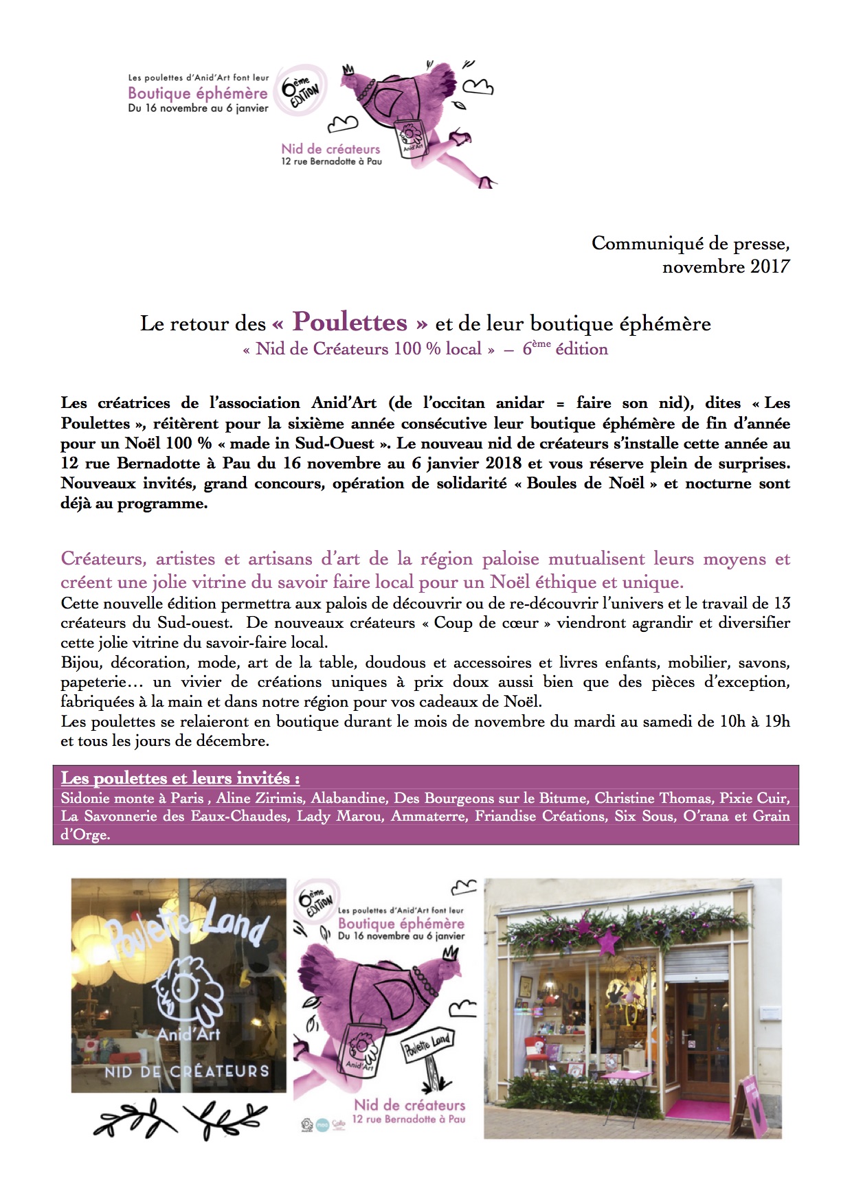 Bonjour, Les Poulettes sont heureuses de vous annoncer l’ouverture de leur 6 ème boutique éphémère à Pau. Le nid s’est installé rue Bernadotte le 16 novembre dernier et fermera ses portes le 6 janvier. Nous serions heureuses de vous rencontrer afin de caqueter avec vous et de vous présenter le travail et les univers des lire la suite