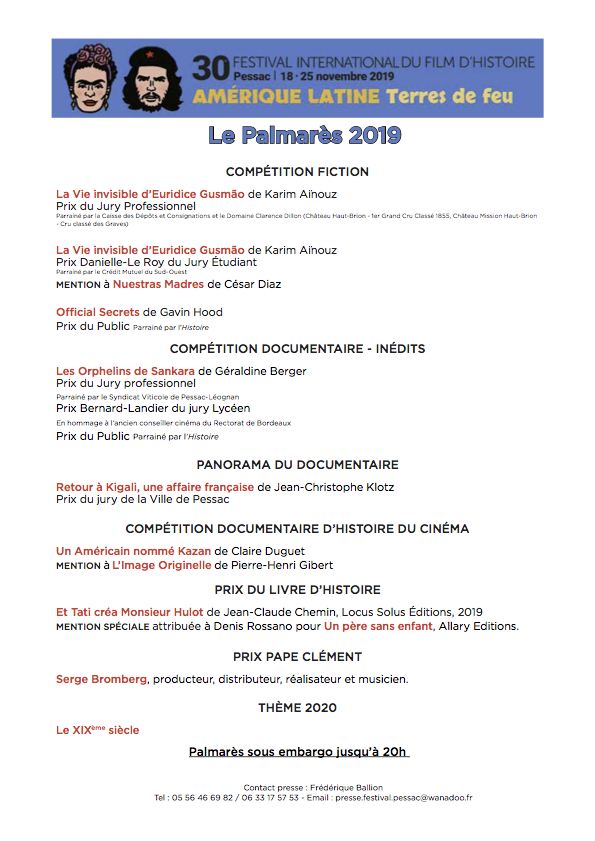Accueil > Communiqués > Palmarès de ce 30e Festival International du Film d’Histoire de Pessac