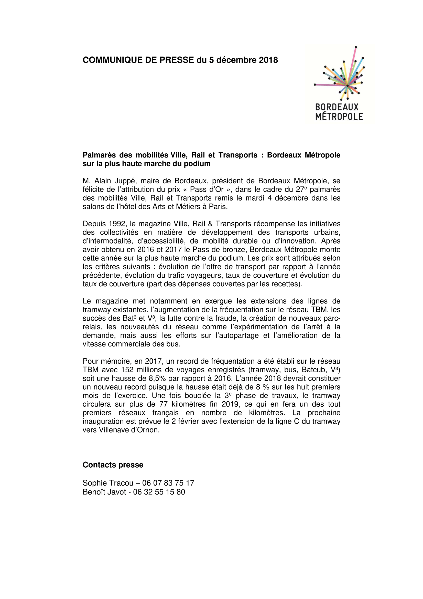 Accueil > Communiqués > Palmarès des mobilités Ville, Rail et Transports : « Pass d’Or » pour Bordeaux