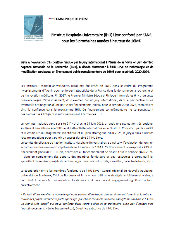 L’Institut Hospitalo-Universitaire (IHU) Liryc, en rythmologie et modélisation cardiaque, a été conforté par l’ANR (Agence Nationale de la Recherche) pour les 5 prochaines années avec l’attribution d’un financement complémentaire de 16M€, suite à l’évaluation très positive rendue par un jury international le 23 juin dernier.