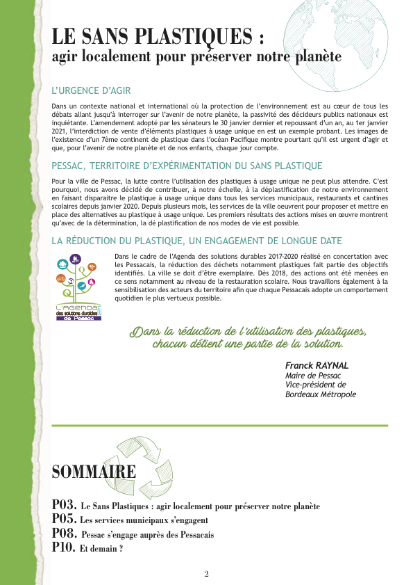 Ci-joint le dossier de presse relatif aux actions réalisées par la ville dans le cadre de sa politique Pessac sans Plastique.