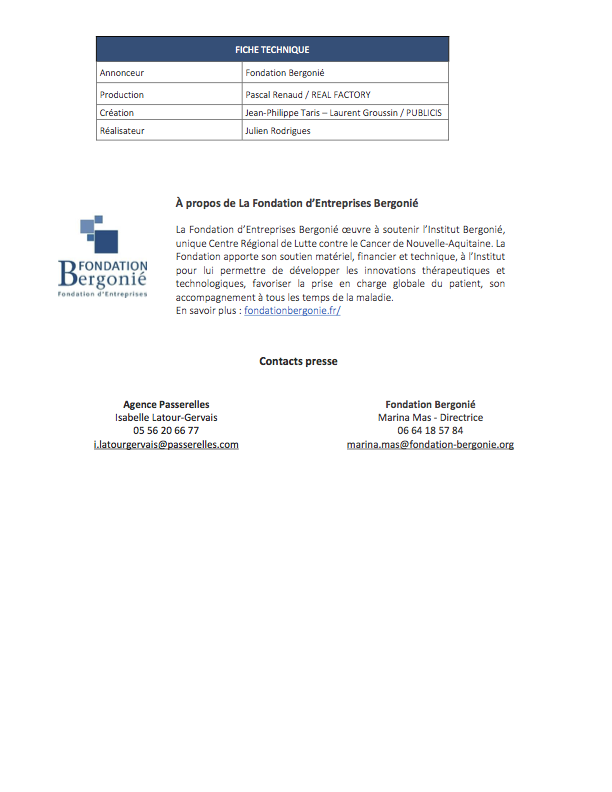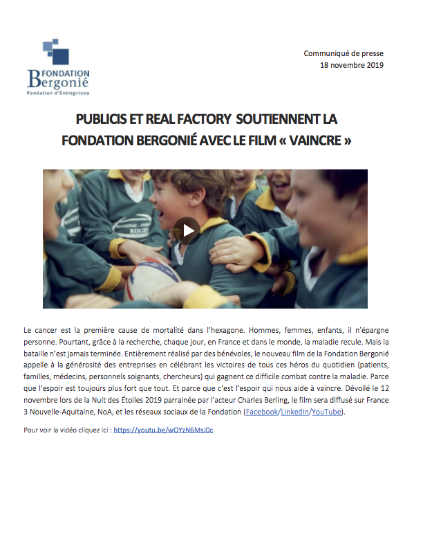 Accueil > Communiqués > Publicis et Real Factory soutiennent La Fondation Bergonié avec le film « Vaincre »