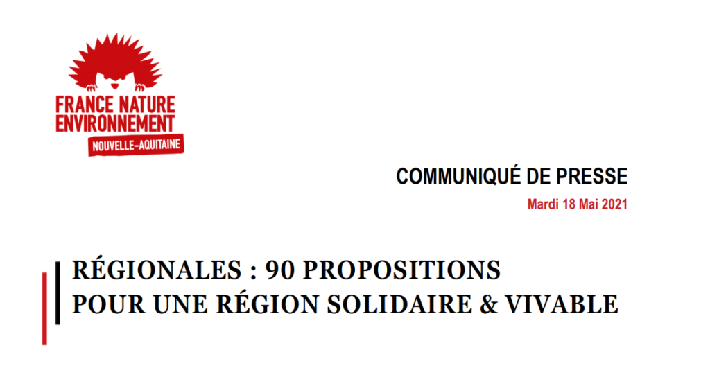 France Nature Environnement Nouvelle-Aquitaine se mobilise pour interpeller les candidates et candidats aux élections régionales pour une Nouvelle-Aquitaine solidaire et vivable. La confédération régionale des associations de protection de la nature et de l’environnement de Nouvelle-Aquitaine, liste 90 engagements regroupés en 4 thématiques, pour une application transversale du principe de santé globale : santé humaine, lire la suite