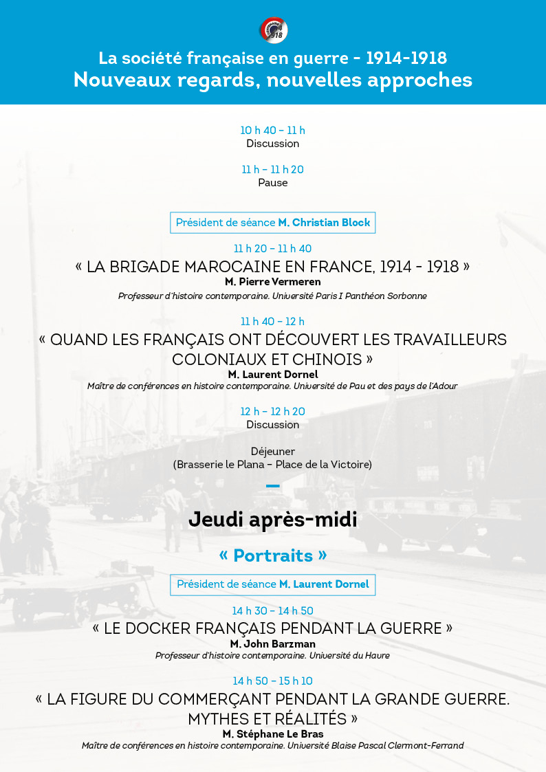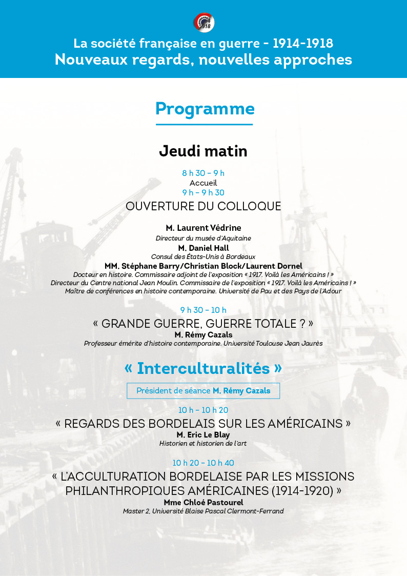 Mesdames, Messieurs, chers (es) amis (es), Nous sommes heureux de vous inviter à une riche semaine dans le cadre du colloque organisé par le Café Historique les 16 et 17 novembre à l’auditorium du musée d’Aquitaine, au Centre national Jean Moulin et à la brasserie le Plana. Nous aurons le plaisir de vous convier à lire la suite