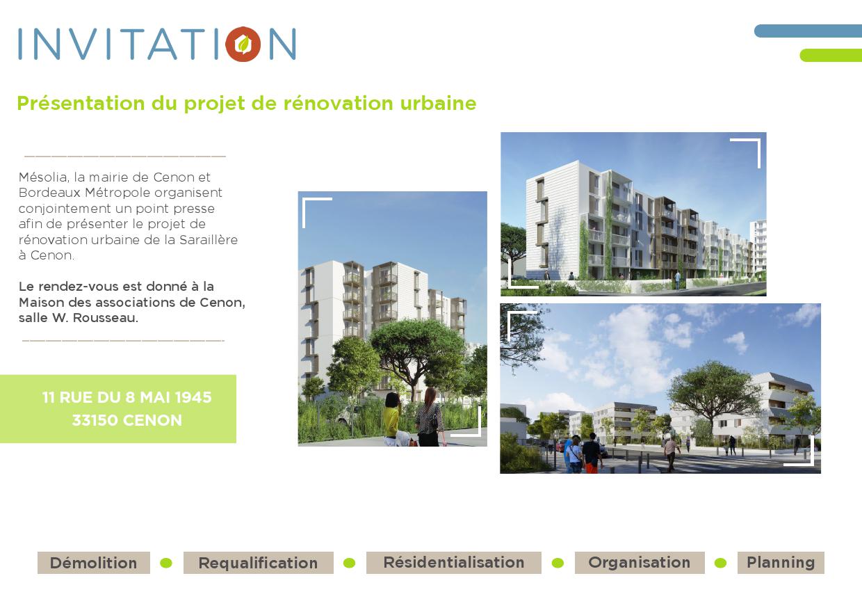 Mésolia, la mairie de Cenon et Bordeaux Métropole organisent conjointement un point presse afin de présenter le projet de rénovation urbaine de la Saraillère à Cenon.