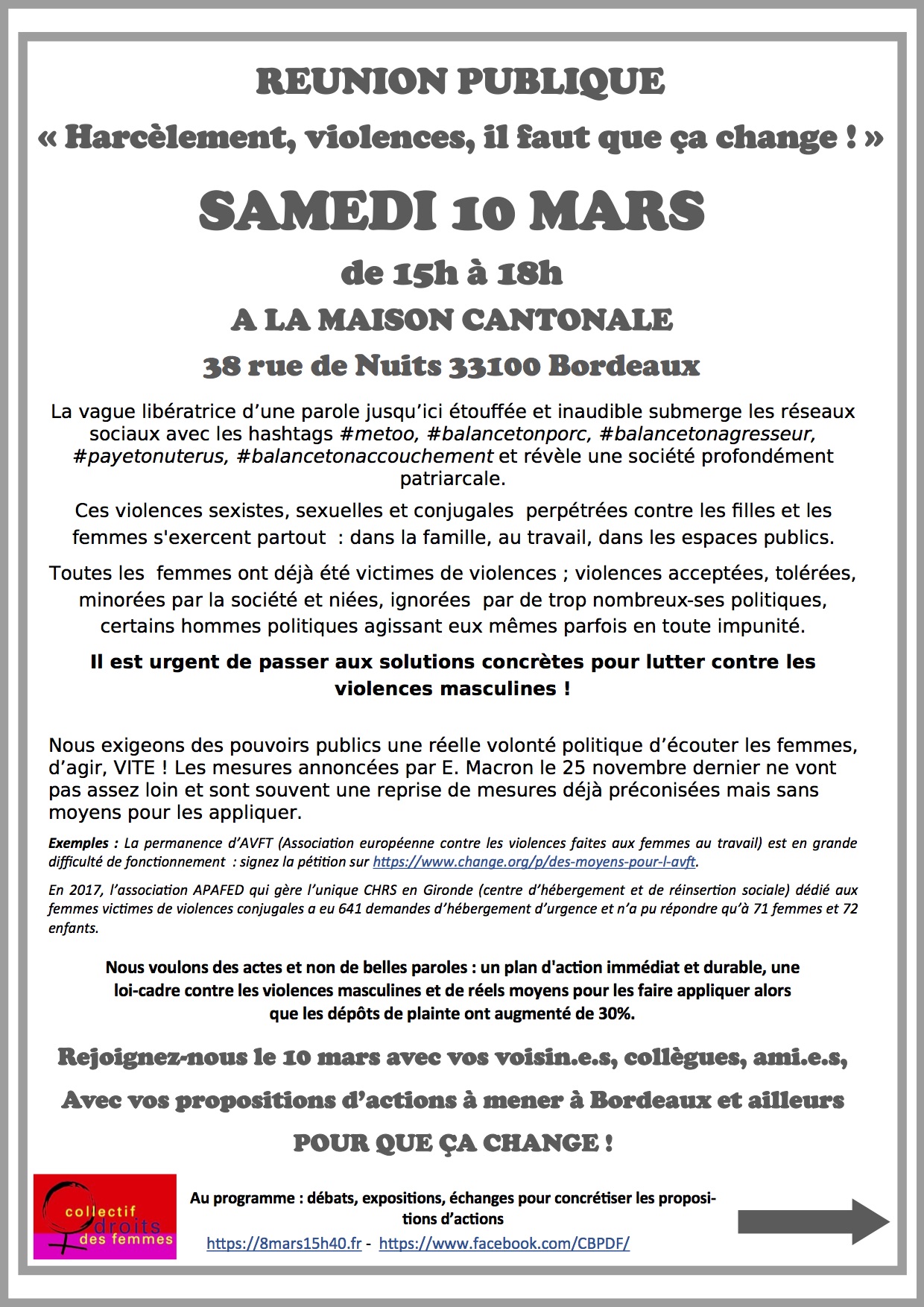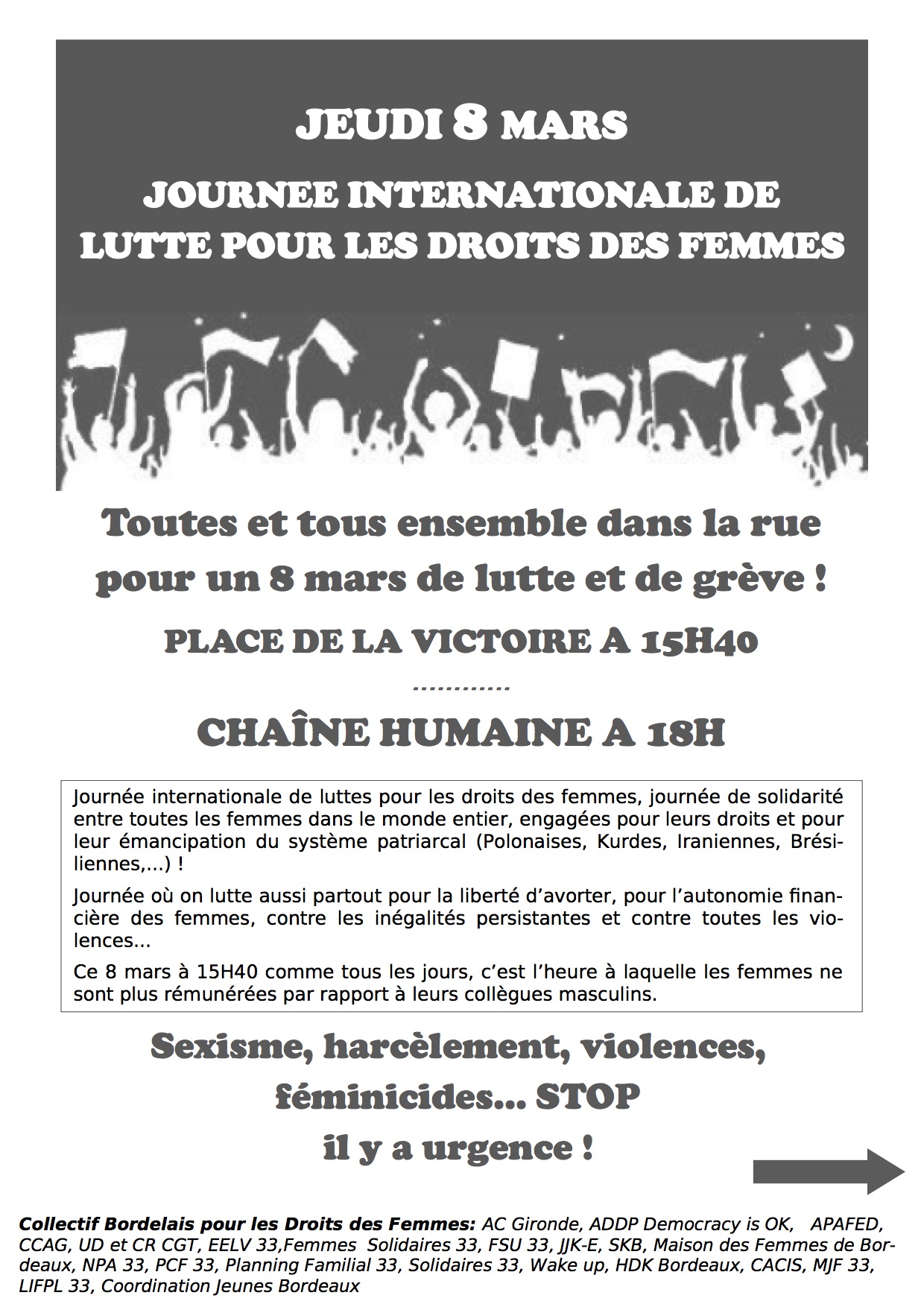 INVITATION SAMEDI 10 MARS Dans un contexte de débat et de mobilisation féministe important, aussi bien dans les rédactions que dans la société, le collectif pour le droit des femmes Bordelais a décidé d’inviter largement toutes les personnes qui souhaitent faire avancer le droit des femmes à l’égalité à une réunion publique « il faut que lire la suite