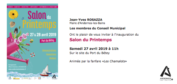 Samedi 27 & Dimanche 28 avril 2018 La ville d’Andernos les Bains organise les 27 & 28 avril prochains son Salon du Printemps, sur le Port de Plaisance du Bétey. Le Salon du Printemps vient traditionnellement marquer le début des « beaux jours ». Organisé autour du Port de plaisance du Bétey pour son cadre exceptionnel en lire la suite