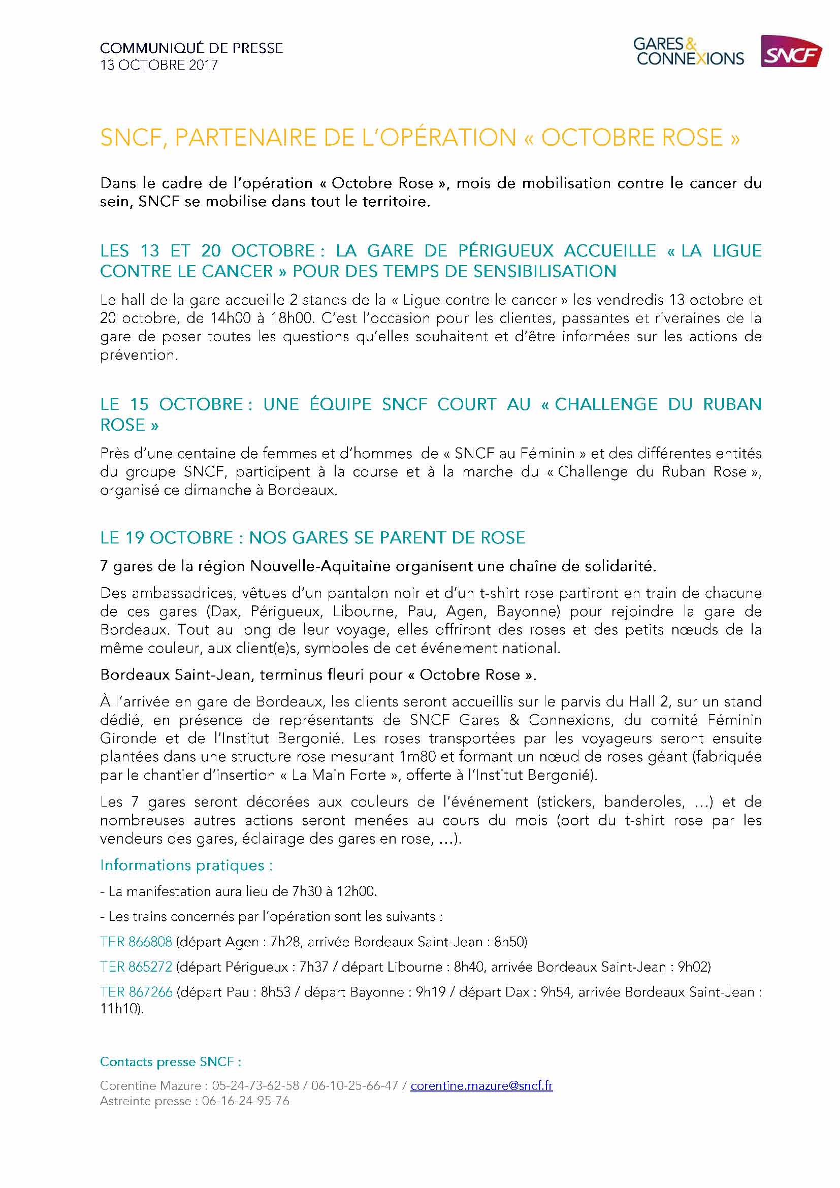 Bonjour, Vous trouverez ci-dessous le communiqué de presse portant sur toutes les actions menées par SNCF pour soutenir Octobre Rose. N’hésitez pas à revenir vers moi pour plus de précisions. Très cordialement, Corentine CORENTINE MAZURE Responsable Presse – Communication externe – Partenariats SNCF MOBILITÉS – DIRECTION RÉGIONALE NOUVELLE-AQUITAINE AGENCE lire la suite