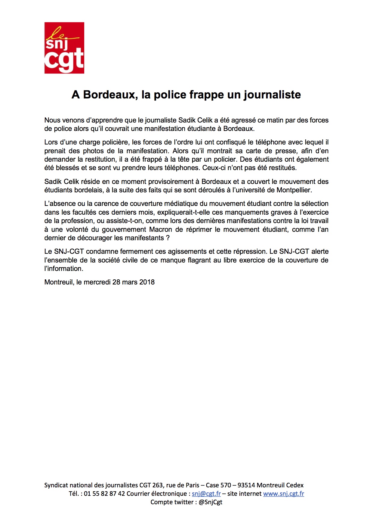 Accueil > Communiqués > SNJ-CGT – A Bordeaux, la police frappe un journaliste