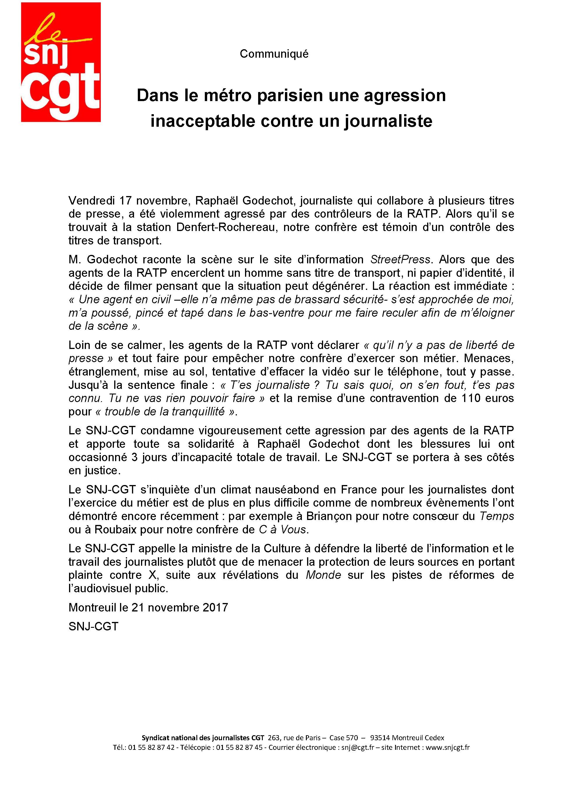 Bonsoir Veuillez trouver en pj le communiqué du SNJ-CGT : « Dans le métro parisien une agression inacceptable contre un journaliste » Il fait suite à l’agression dont a été victime M Godechot journaliste indépendant le 17 novembre dernier. Cordialement Emmanuel VIRE SNJ-CGT