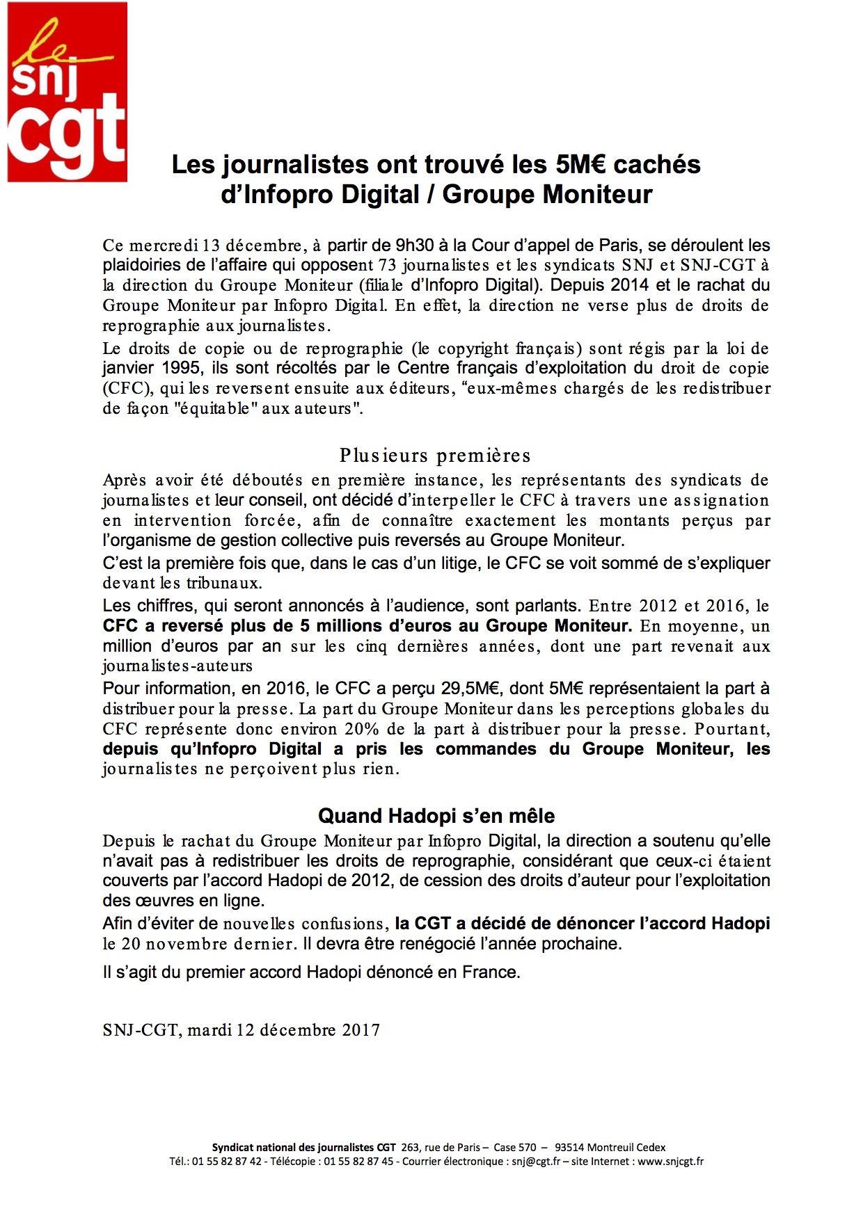Bonjour, Vous trouverez, en pièce jointe, notre communiqué sur l’arrêt du versement des droits de reprographie aux journalistes d’Infopro Digital et du procès qui les opposent à leur direction. Cordialement. SNJ-CGT Communiqué en pdf : cfc-droit-dauteur