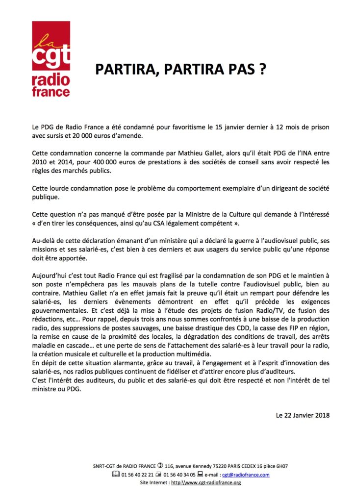 Bonjour, Vous trouverez, en pièce jointe, le communiqué de la CGT de Radio France : « Partira, partira pas ? » sur la question du départ de Mathieu Gallet et la situation de l’audiovisuel public. Cordialement SNJ-CGT Communiqué de presse en pdf : partira-partira-pas-1
