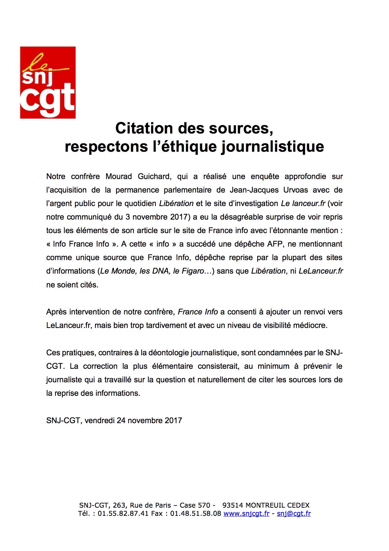 Bonjour, Vous trouverez, en pièce jointe, notre communiqué « Citation des sources, respectons l’éthique journalistique » sur la reprise de la source de l’enquête sur Urvoas par la presse sans mention de l’auteur Mourad Guichard. Cordialement. SNJ-CGT