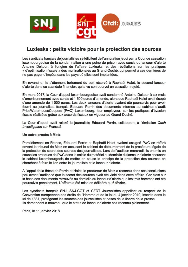 Bonjour, Veuillez trouver, en pièce jointe, notre communiqué commun (SNJ, SNJ-CGT, CFDT Journalistes) sur l’annulation jeudi par la Cour de cassation luxembourgeoise de la condamnation à une peine de prison avec sursis du lanceur d’alerte Antoine Deltour intitulé « Luxleaks : petite victoire pour la protection des sources ». Cordialement. SNJ-CGT   Communiqué en pdf : communique-luxleaks-1