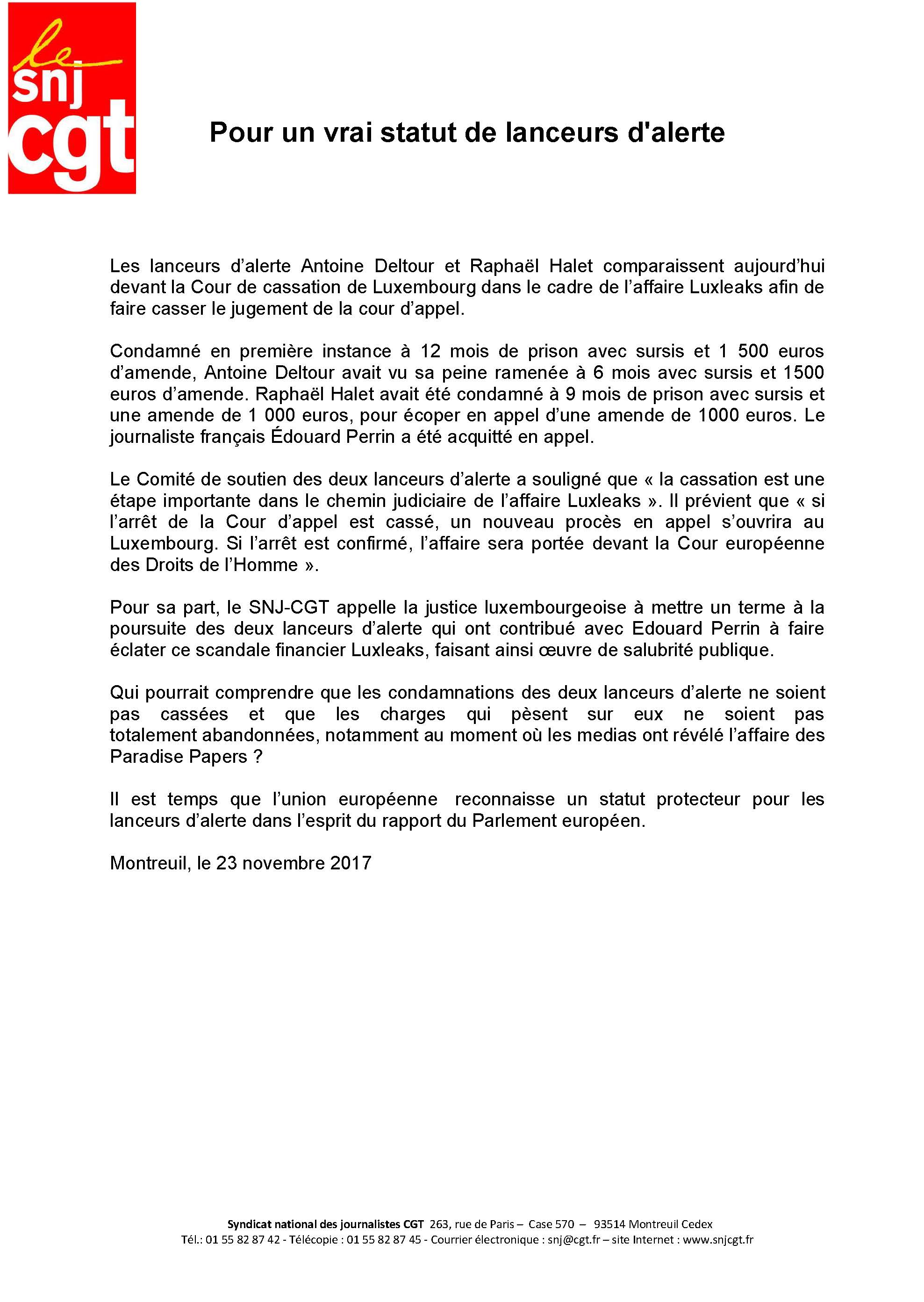 Bonjour, Veuillez trouver en pj le communiqué du SNJ-CGT : « Pour un vrai statut de lanceurs d’alerte » Cordialement SNJ-CGT