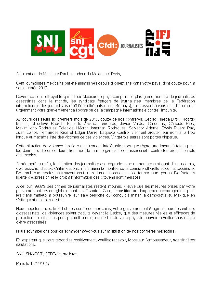 Bonjour, Veuillez trouver en pj une lettre ouverte des syndicats français (SNJ, SNJ-CGT, CFDT-Journalistes) membres de la Fédération internationale des journalistes (FIJ) à l’Ambassadeur du Mexique afin de l’interpeller sur la situation dramatique des journalistes dans son pays. Le Mexique est le pays comptant le plus grand nombre de journalistes assassinés (100 en 17 ans lire la suite