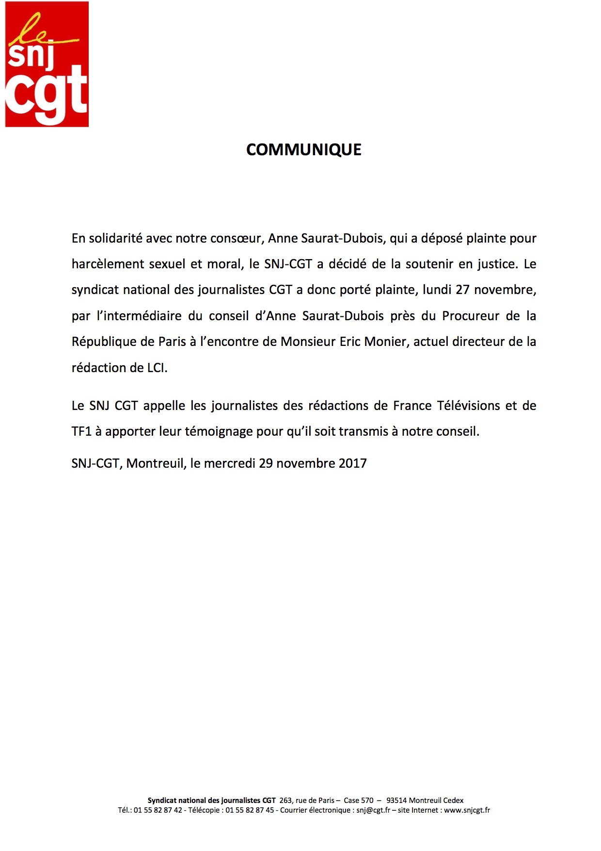 Bonjour, Vous trouverez, en pièce jointe, notre communiqué, en solidarité avec notre consœur, Anne Saurat-Dubois, qui a déposé plainte pour harcèlement sexuel et moral à l’encontre de Monsieur Eric Monier. Cordialement. SNJ-CGT Communiqué en pdf : solidarite-avec-anne-saurat-dubois-1