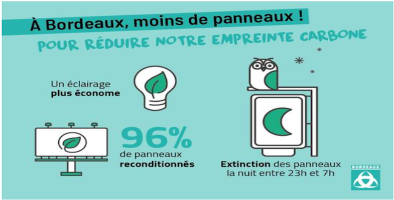 Dans le cadre de sa nouvelle concession de mobilier urbain publicitaire et non publicitaire votée à l’occasion du conseil municipal de juin dernier, effectif depuis le début du mois d’octobre, la Ville a souhaité réduire l’impact énergétique de ces mobiliers urbains, lutter contre la pollution lumineuse, en allant au-delà des exigences légales. La Ville a ainsi imposé au délégataire l’extinction des moteurs et l’éclairage des panneaux publicitaires entre 23 h et 7h du matin. Ce changement est déjà visible depuis plusieurs jours pour les Bordelaises et Bordelais.