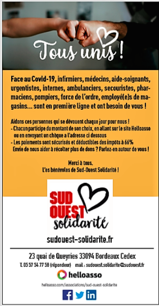 Bonjour à tous, Le chrono est lancé, il faut apporter un soutien immédiat à tous ceux qui agissent pour nous. Pour nous tous! C’est pourquoi, tout esprit de chapelle exclu, nous demandons à nos confrères, amis, partenaires de publier ces informations. C’est grâce à eux qu e nous sommes soignés, nourris, que nous sommes en lire la suite